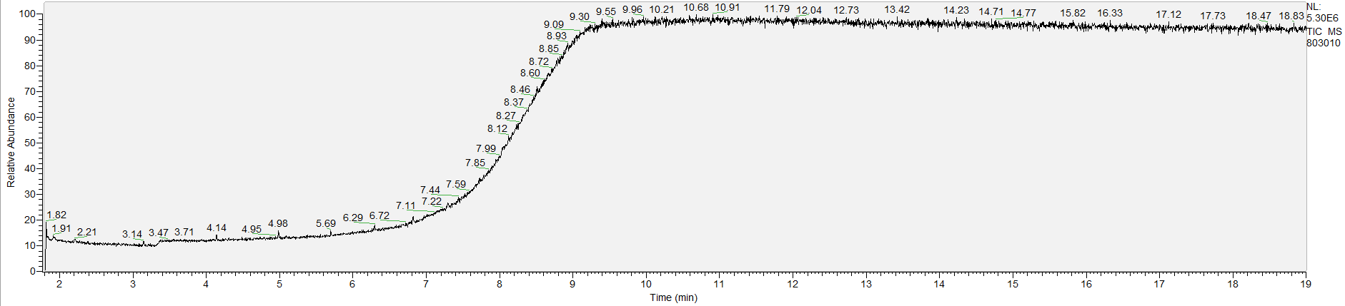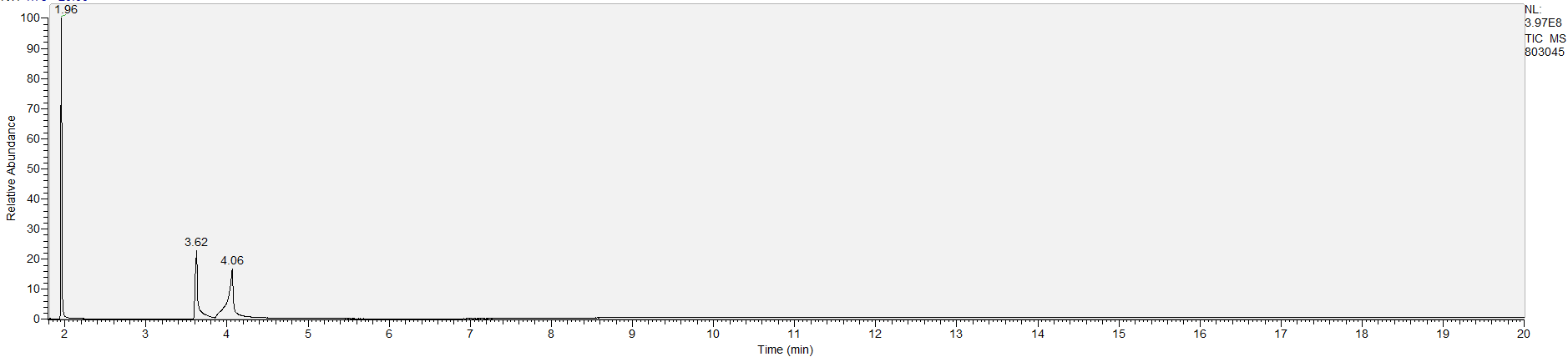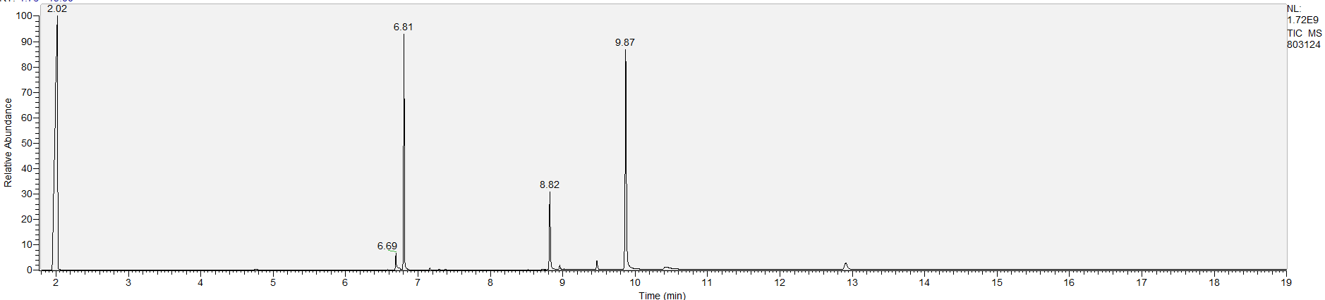 Reading the graph. The "relative abundance" on the vertical axis is a rough relative estimate of how much is present. It is not quantification. The time (min) on the horizontal axis means the time at which each of the substances was detected. But you can also look at the overall pattern to get a sense of what's common in your area. Also, similar substances can sometimes clump together into one peak, so we may run more tests to get separation. When we list the substances above, we've taken a whole set of lab tests into account, and it's not just looking at results from one graph.