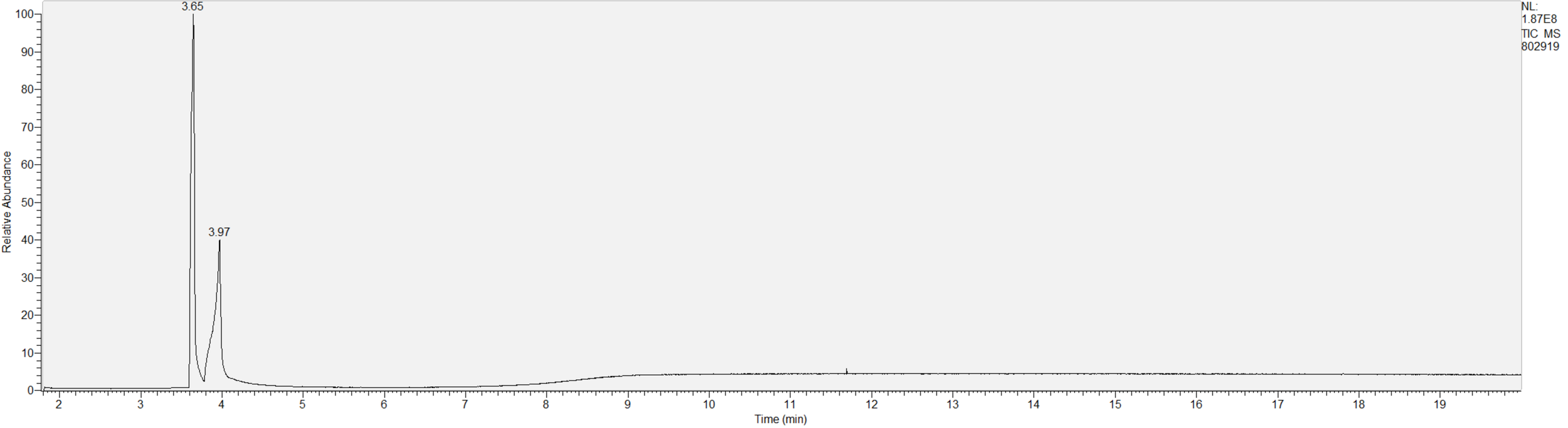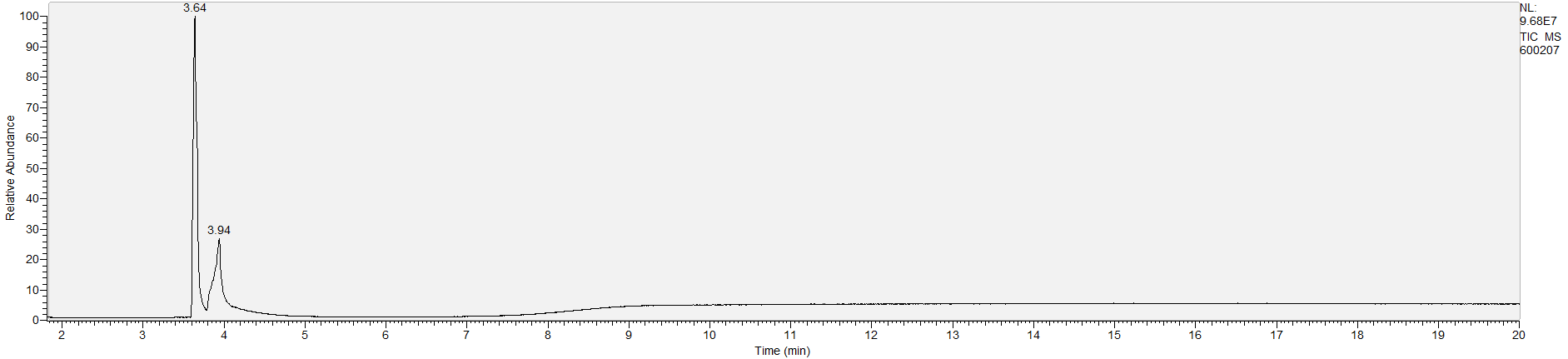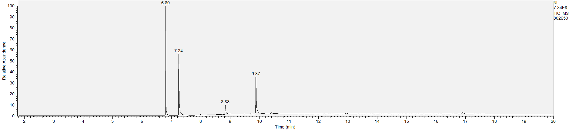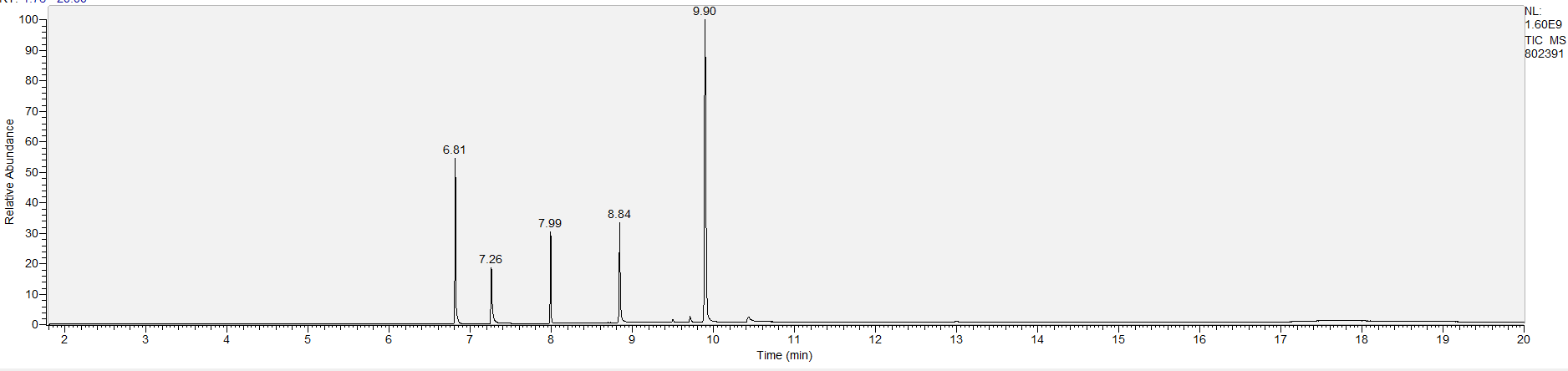 Reading the graph. The "relative abundance" on the vertical axis is a rough relative estimate of how much is present. It is not quantification. The time (min) on the horizontal axis means the time at which each of the substances was detected. But you can also look at the overall pattern to get a sense of what's common in your area. Also, similar substances can sometimes clump together into one peak, so we may run more tests to get separation. When we list the substances above, we've taken a whole set of lab tests into account, and it's not just looking at results from one graph.